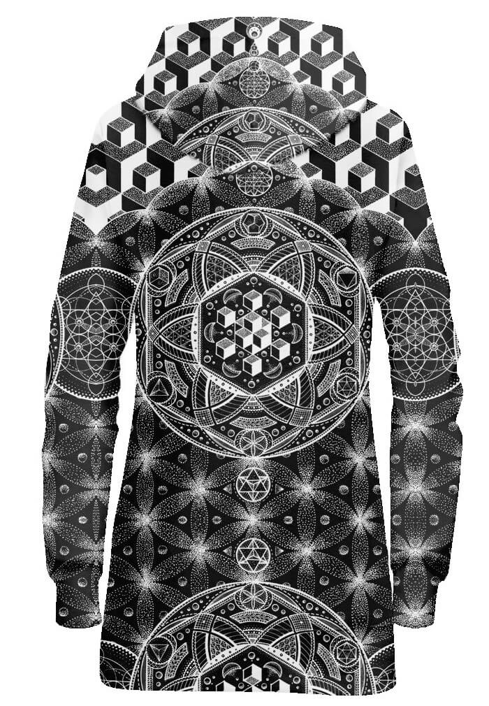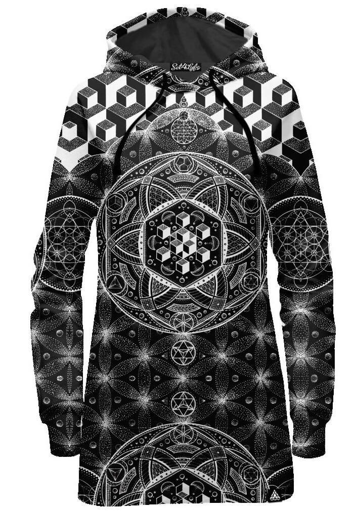 This black and white long dress hoodie is covered in sacred geometry and other visionary inspired artwork. Perfect for cool nights on the festival campgrounds. One of those unique festival clothing items that no one else has, this hoodie will make you stand out like no other. It's thigh length so you can wear this by itself or wear a pair of leggings under it to create your perfect look. This is perfect for all of your favorite camping festivals and raves, those cool mornings will be so comfy with this dress hoodie. Watching the sunrise at Burning Man, or staring into the trees at Electric Forest, this will absolutely be your favorite piece of clothing.