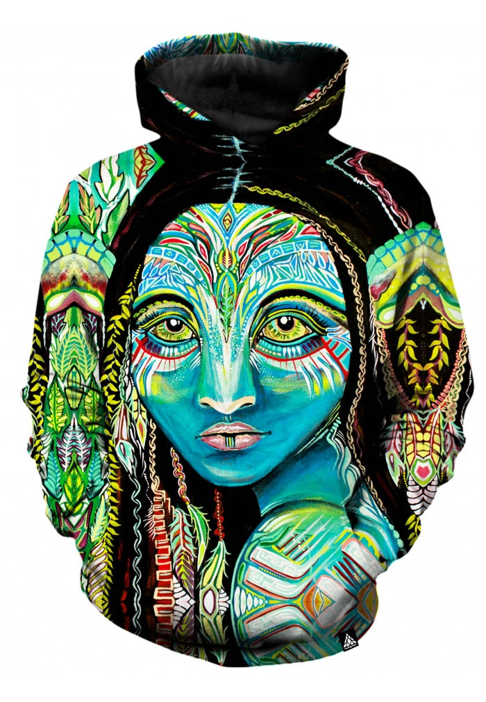 Our all-over print pull over hoodies are made of a premium soft-spun polyester that is silky smooth to the touch. Our printing process ensures that the design will never fade, crack or wrinkle. Each hoodie is made to order and can take 7-10 days to create before it ships. These hoodies are perfect for warming up before or after a rave.