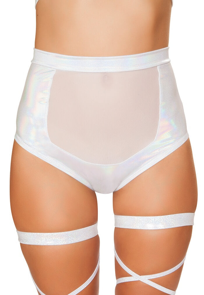 These metallic white shorts feature a large sheer panel on the front. The high waist cut fits just like you want it, not too high and designed not to bunch. The sheer panel in the front is totally unique and will work in Ibiza or prancing around Electric Forest. Water resistant, tons of stretch, the perfect pair of high waist festival shorts.